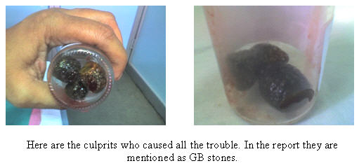 Two days later, we went there (Saturday 16th). We met one Dr .Mohan. He said that the surgery has to be done immediately. This suited us very well. He told us that the gallbladder and the stones would be removed through laparoscopic surgery. We got all the tests done there (Blood, ECG, X-ray, Scan . .etc.), and gave him the reports. The surgery was fixed for Monday the18th.