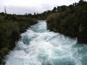 The blue water of the Huka Falls where the Waikato flows through a narrow canyon