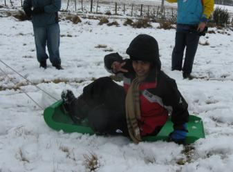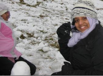Prisy (right) with young friend Waishi and head of snowman