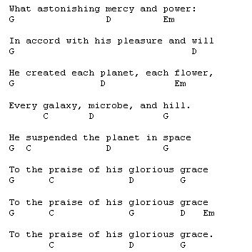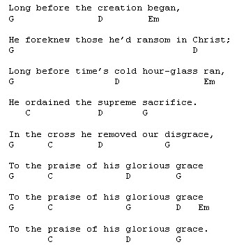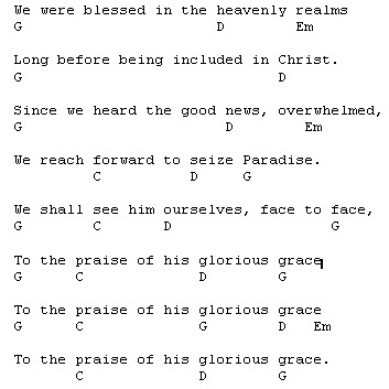 At home, we love to sing To the Praise of His Glorious Grace by D.A. Carson, which we learned at the Easter Conference in Hamilton last year. Incidentally Carson was the conference speaker.