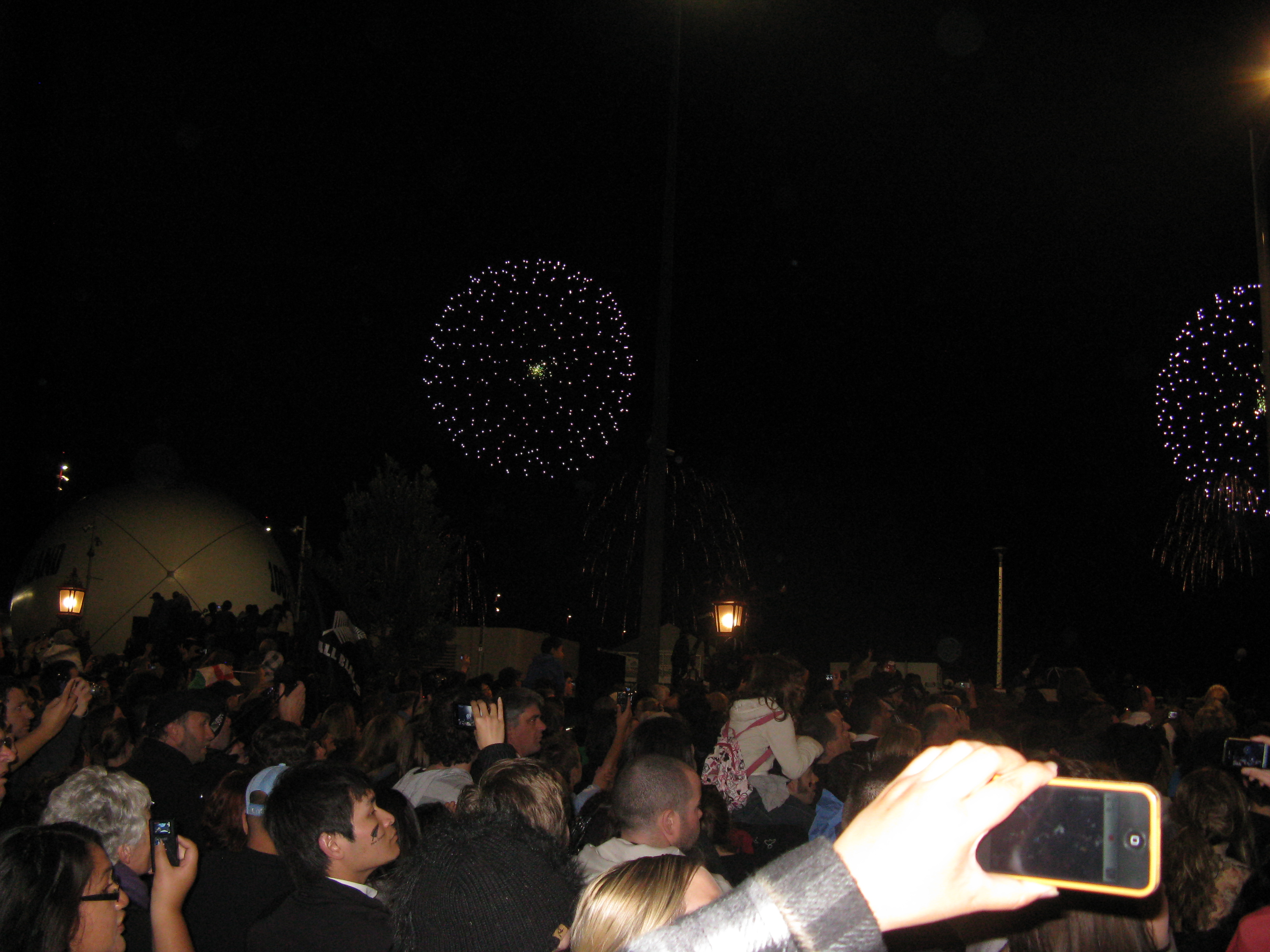 At 7:30 we made our way to one of the big screens. It felt good to be part of such a large group of people. Everyone was having a good time. One problem we had was that we could not see the screen much because some of us were too short. I had to raise my hand high up in the air to take pictures like this one.