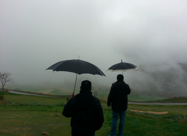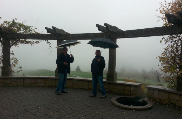 Five minutes drive from Prabhu & Carol’s house is the Golf Club at New Castle with its lovely landscaped grounds with a fabulous view of Lake Washington, Mercer Island, Belevue, and more. SP tells me that this is usually the first place that he takes his guests to, just to be able to share his joy at having a stunning place like that so close to home. Because of the rains he was hesitant to take us there but did so this morning anyway. I enjoyed seeing his disappointment at what awaited us but assured him that we were able to imagine the beauty to some extent.