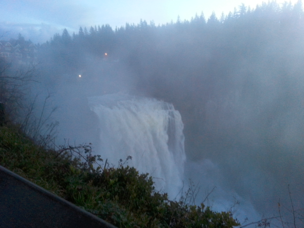 It was getting dark, and I also managed to jam my finger in the car door, but resting my poor finger on a bag of frozen spinach, we managed to get to Snoqualmie Falls. It was beautiful. Because of the recent rains, there was much water and we had the spray on our faces and hair.