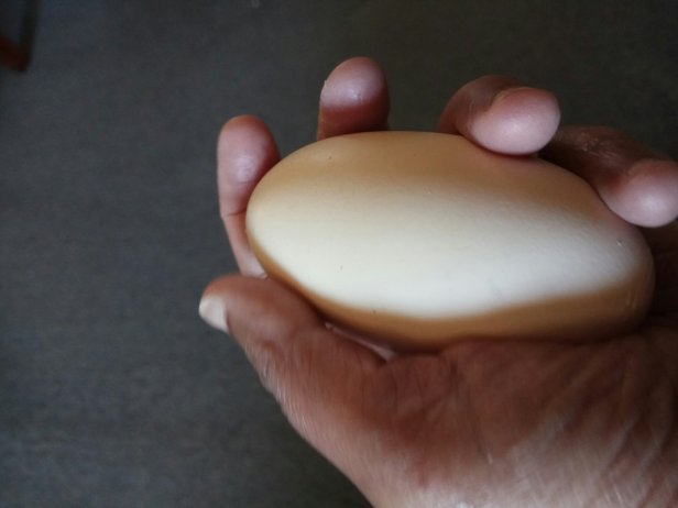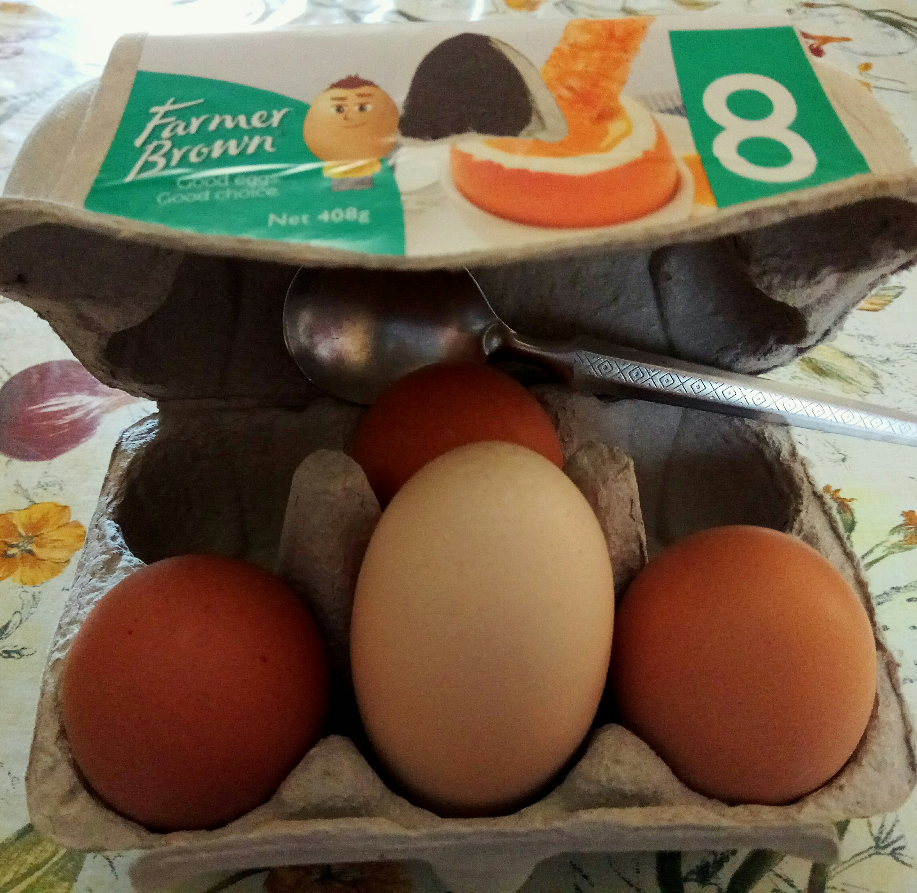 The egg against three size-8 Farmer-Brown eggs from the store. Sigh, how much our words must have affected them! (The egg measures a whopping 8.5cm from pole to pole.)
