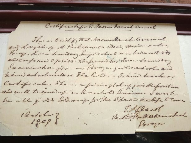 This is to certify that Naomi Marah Ammal, only daughter of A. Packianada Pillai, Headmaster, Porayar Lower Secondary boys’school was born on 18-4-89 and confirmed 27-5-04. She passed her Lower Secondary Examination from our(?) Poraiyar girls’ school and trained school mistress. She holds a Trained Teachers’ Certificate. She is a pious girl of good disposition and well trained in household business. I wish her all God’s blessings for this life and the life to come.