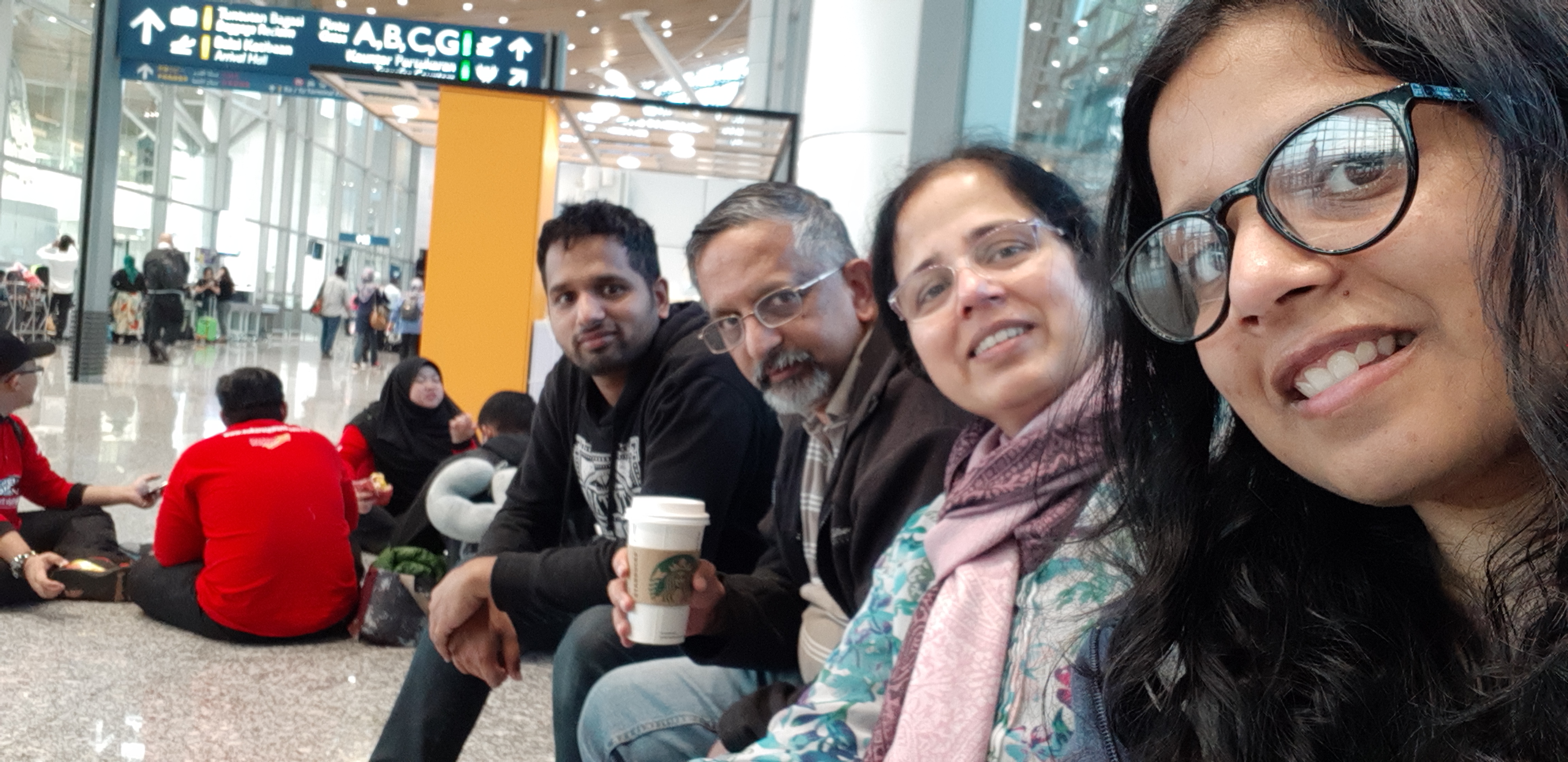 On 5 July, we left Auckland to go to Chennai. We are leaving behind two situations that niggle away constantly at the back of the mind. One is my father GB, whose health seems to be inextricably linked to my presence. We hope that he will cope well with my two-week absence, without declining. I have promised to call him and talk to him every day. The second situation is the birth of our first grandson that will probably take place when we are away. Leaving both these matters in the hands of the Lord, we leave. Here is a picture of us taken during our transit in Malaysia.
