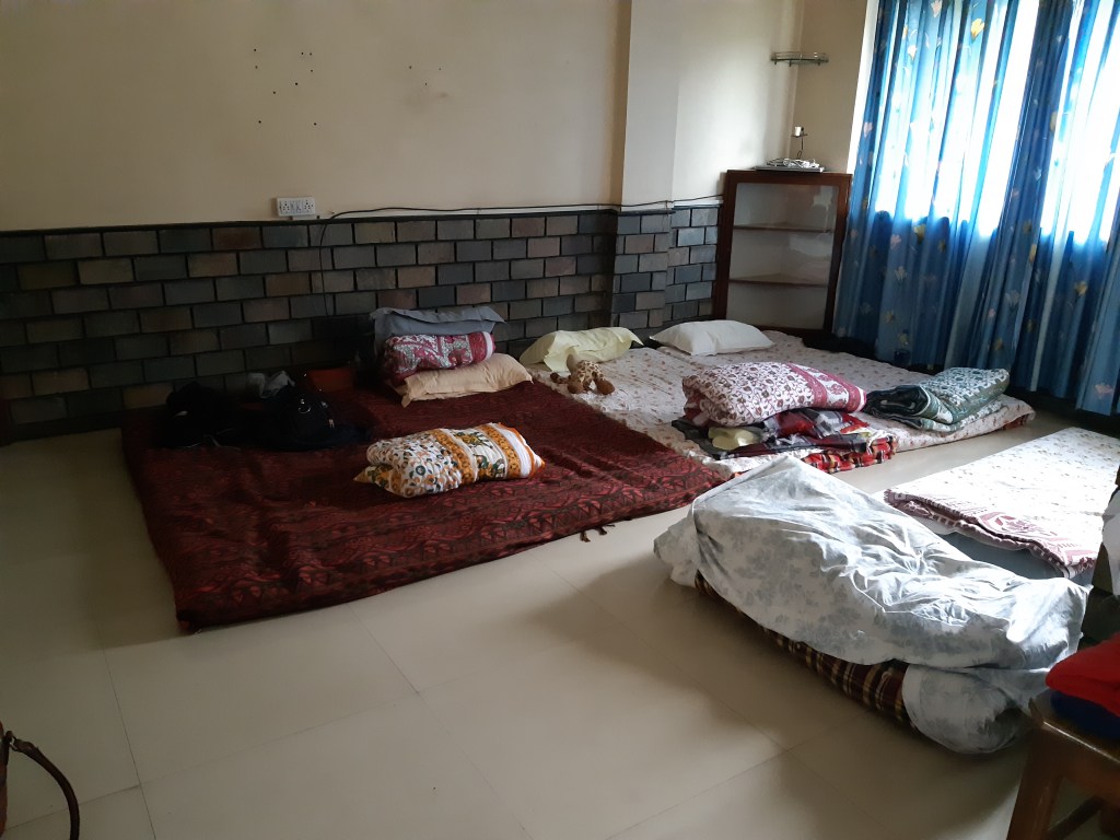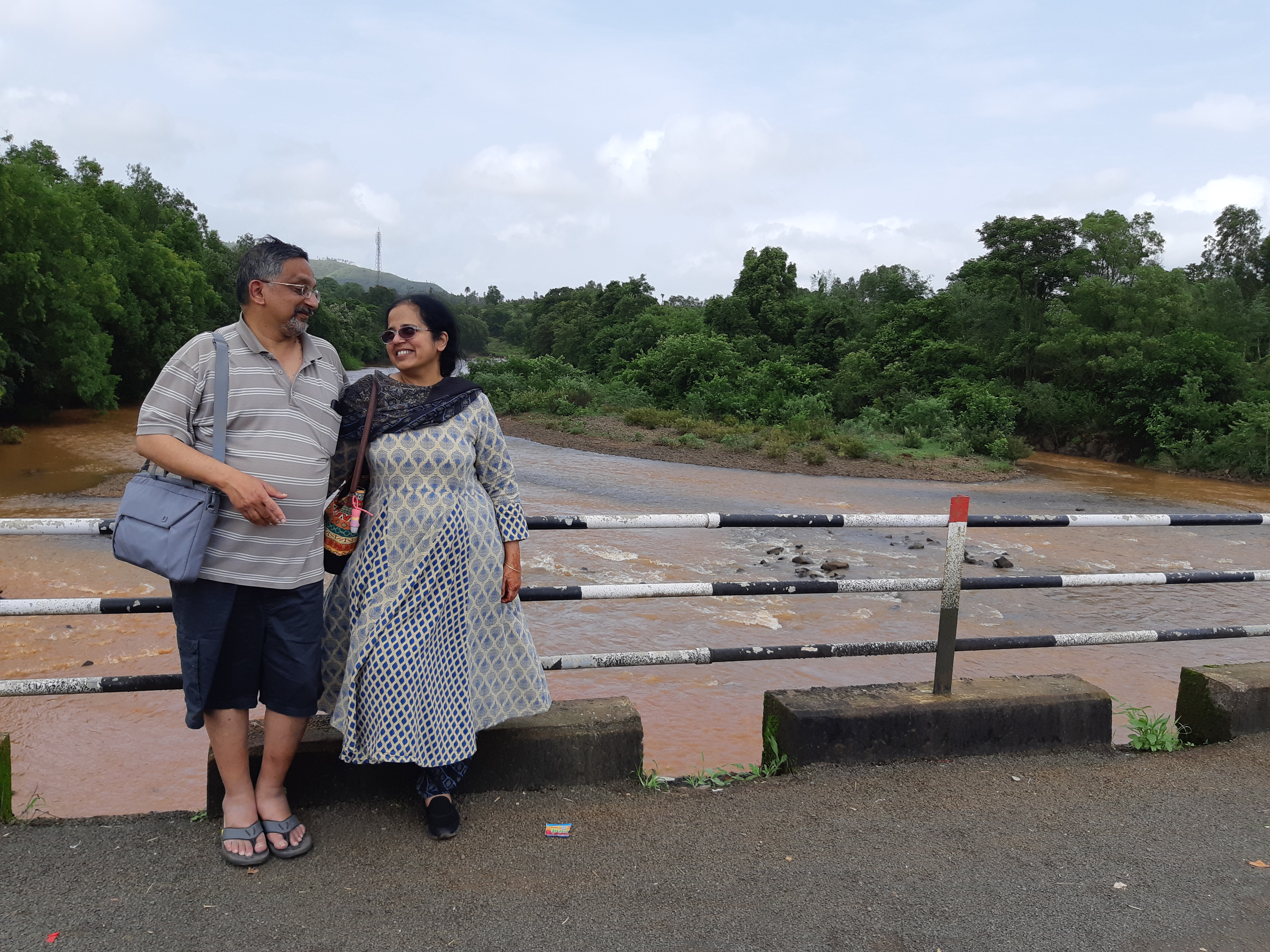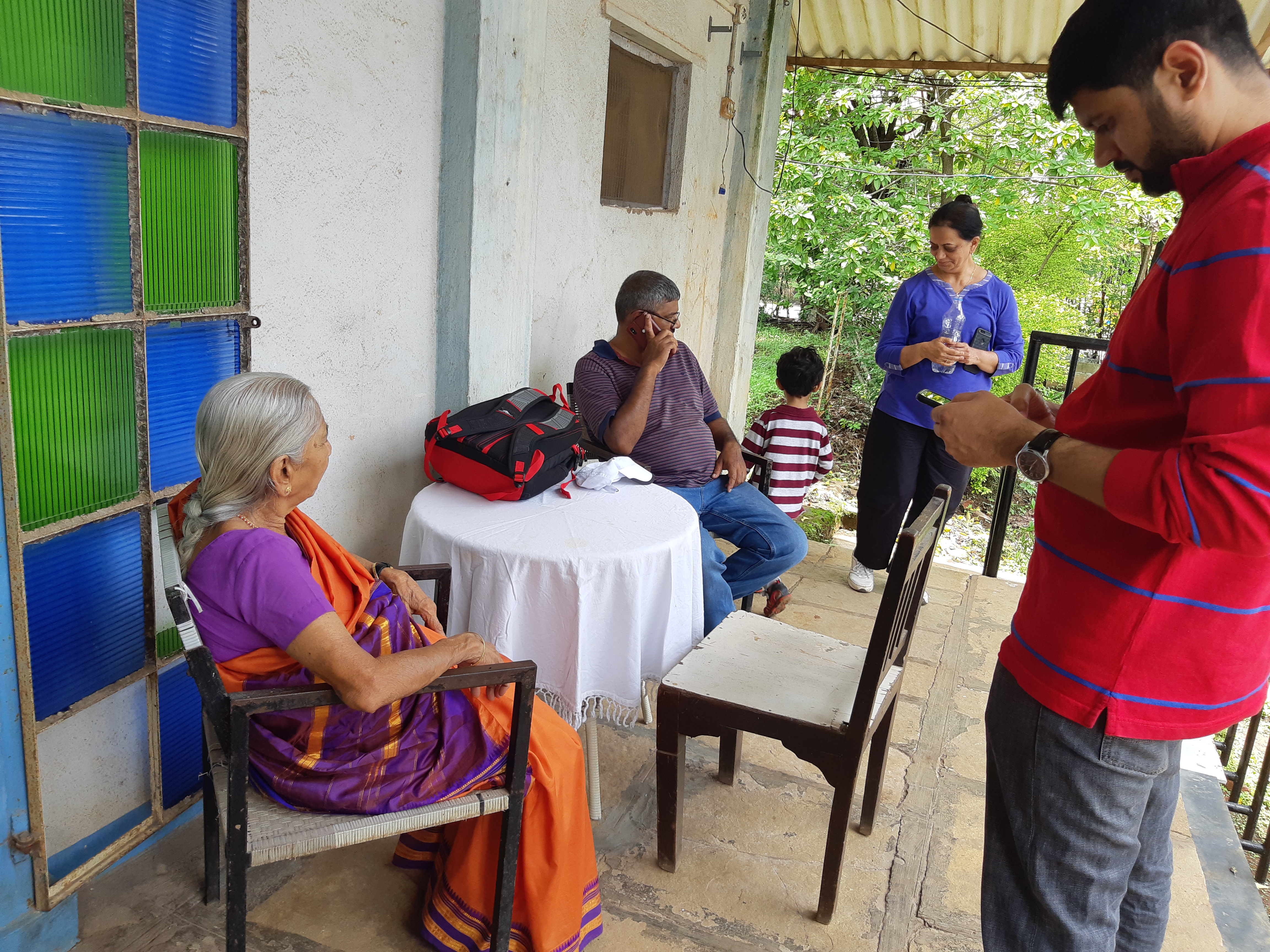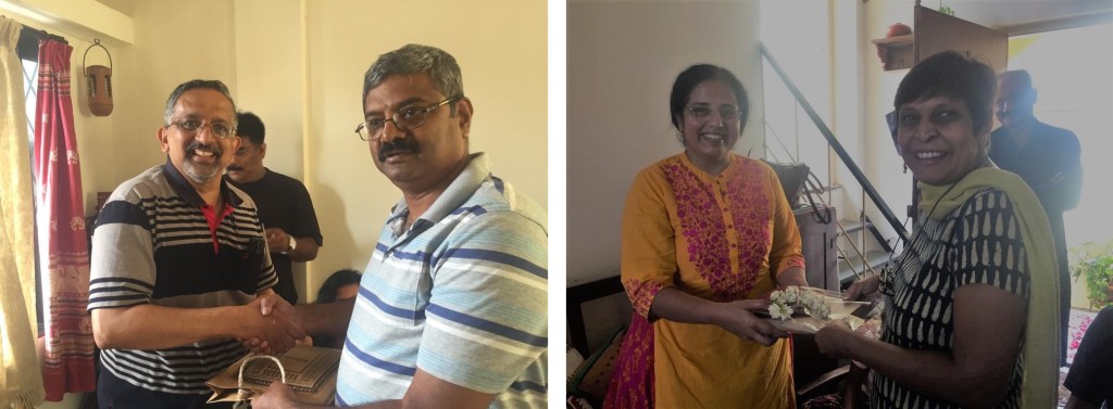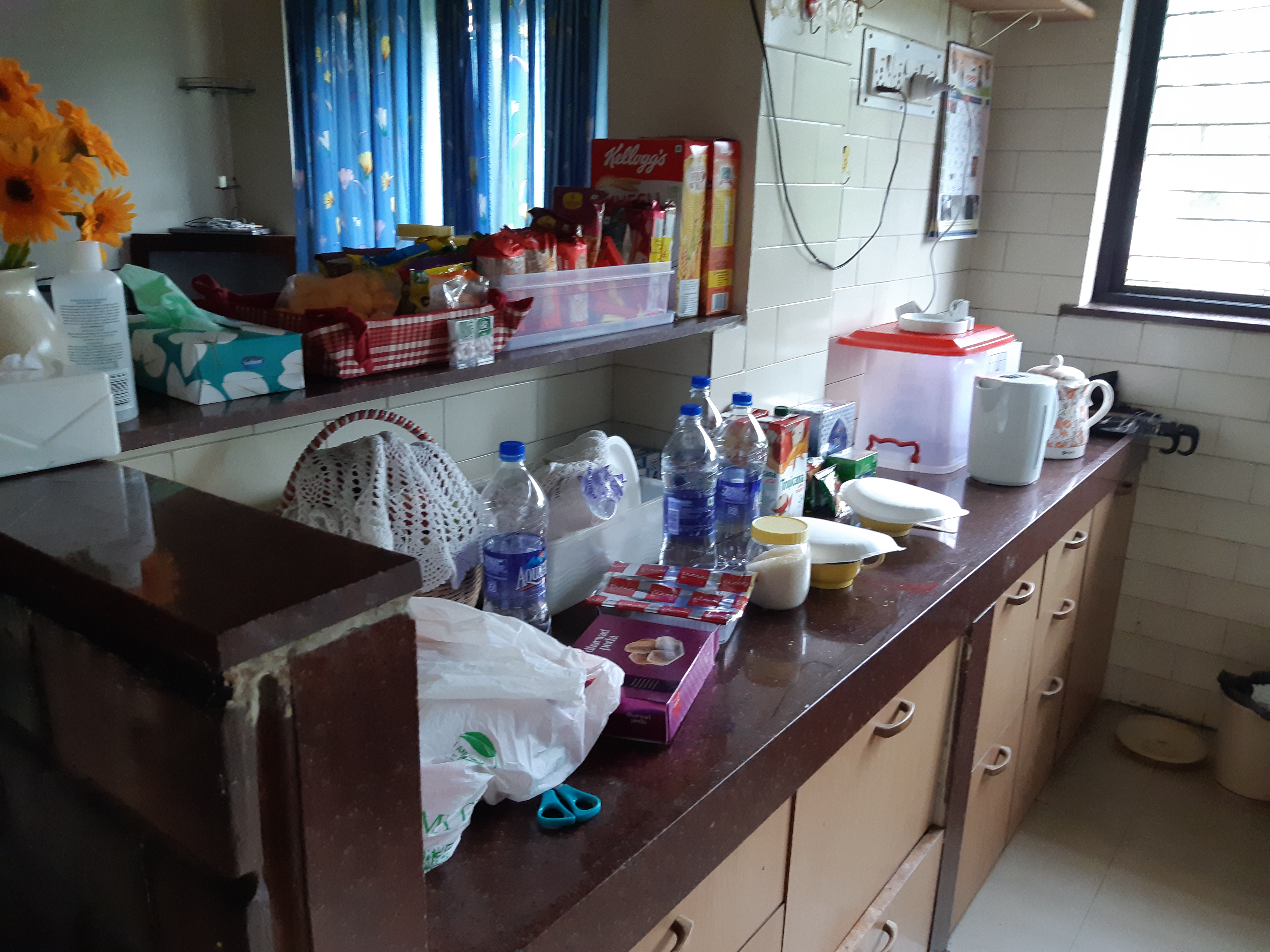 We reached Pune after midnight. (Because Pune is a defense airport, we could not take photos after landing.) Shama’s dad Vishram and their friend Sylvester Rodrigues had come with the driver to receive us. We dodged the rain as we made our way to the cars. The Bhaves had made every conceivable arrangement for our comfort. They put us up in another apartment in the same apartment complex as their own apartment. It had mattresses on the floor and some beds. That night we were transported back to our childhood when families slept together in this way, when they gathered for special occasions. We had been supplied with plenty of snacks and beverages, including bottled water. I was surprised to see an electric kettle too. We met Shama’s mum Hema and Deepika Rodrigues.