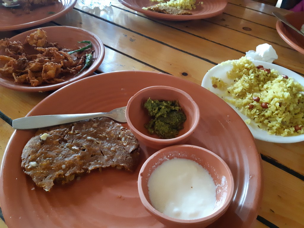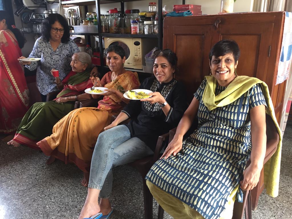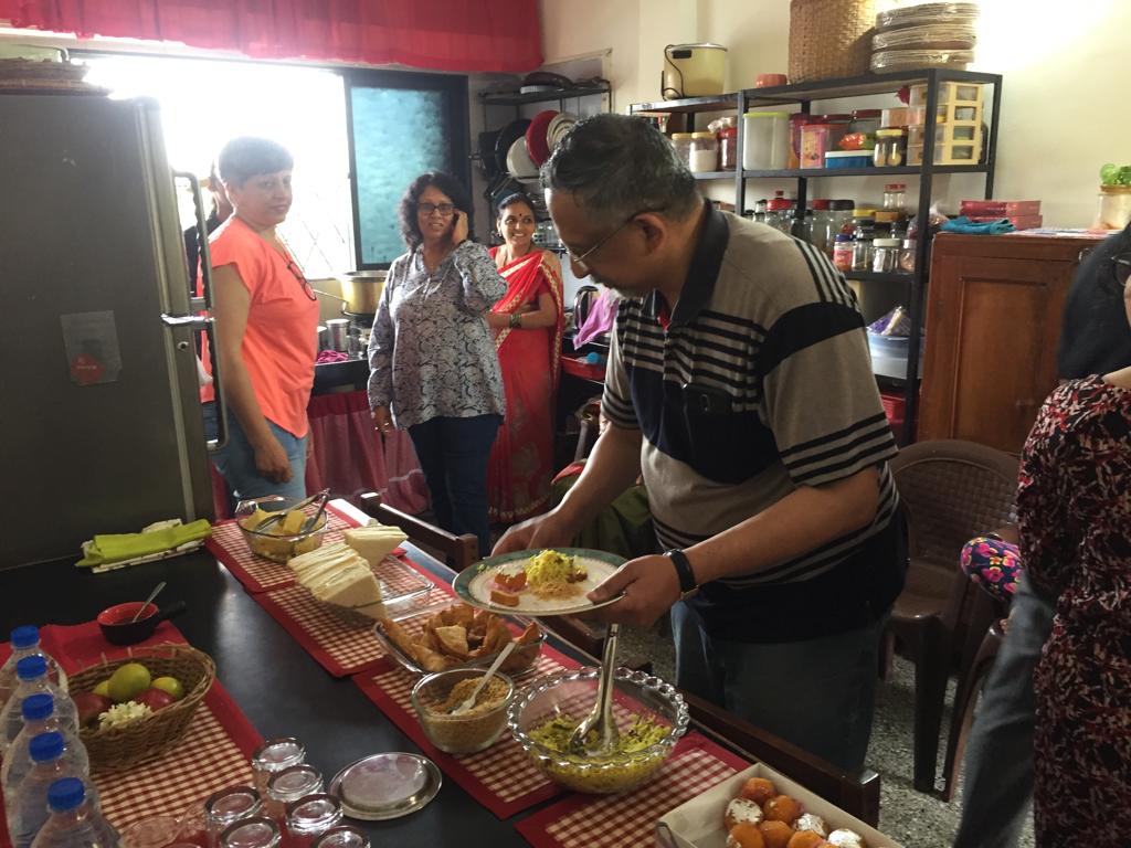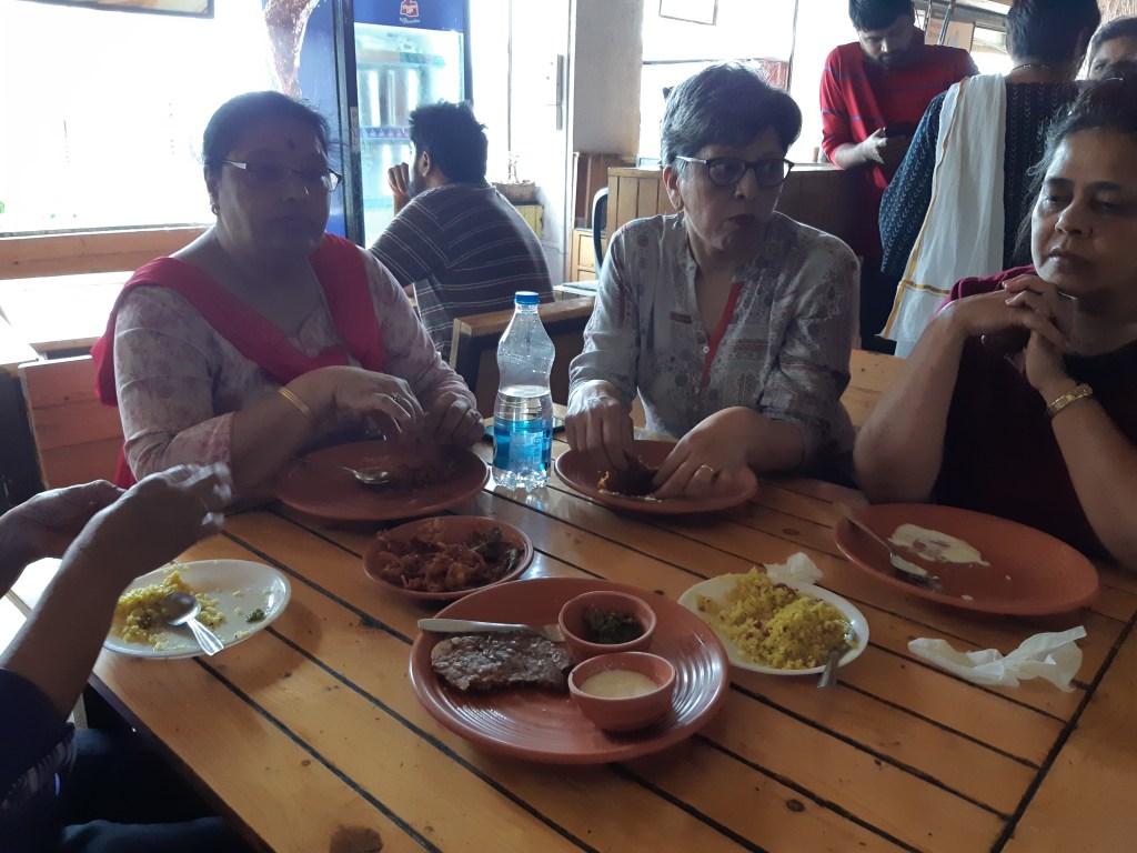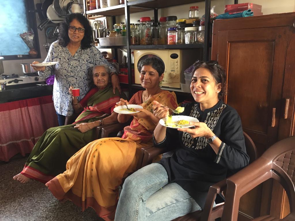 And out the khidki went any pretense to fitness, when we made our way downstairs and up again, huffing and puffing, to the Bhave apartment, where we were presented with a wonderful spread. (From the moment we landed in Pune, we began to meet members of the Bhaves’ close circle, and this continued all through this day too, starting with meeting Rhoda Rathnam.)
