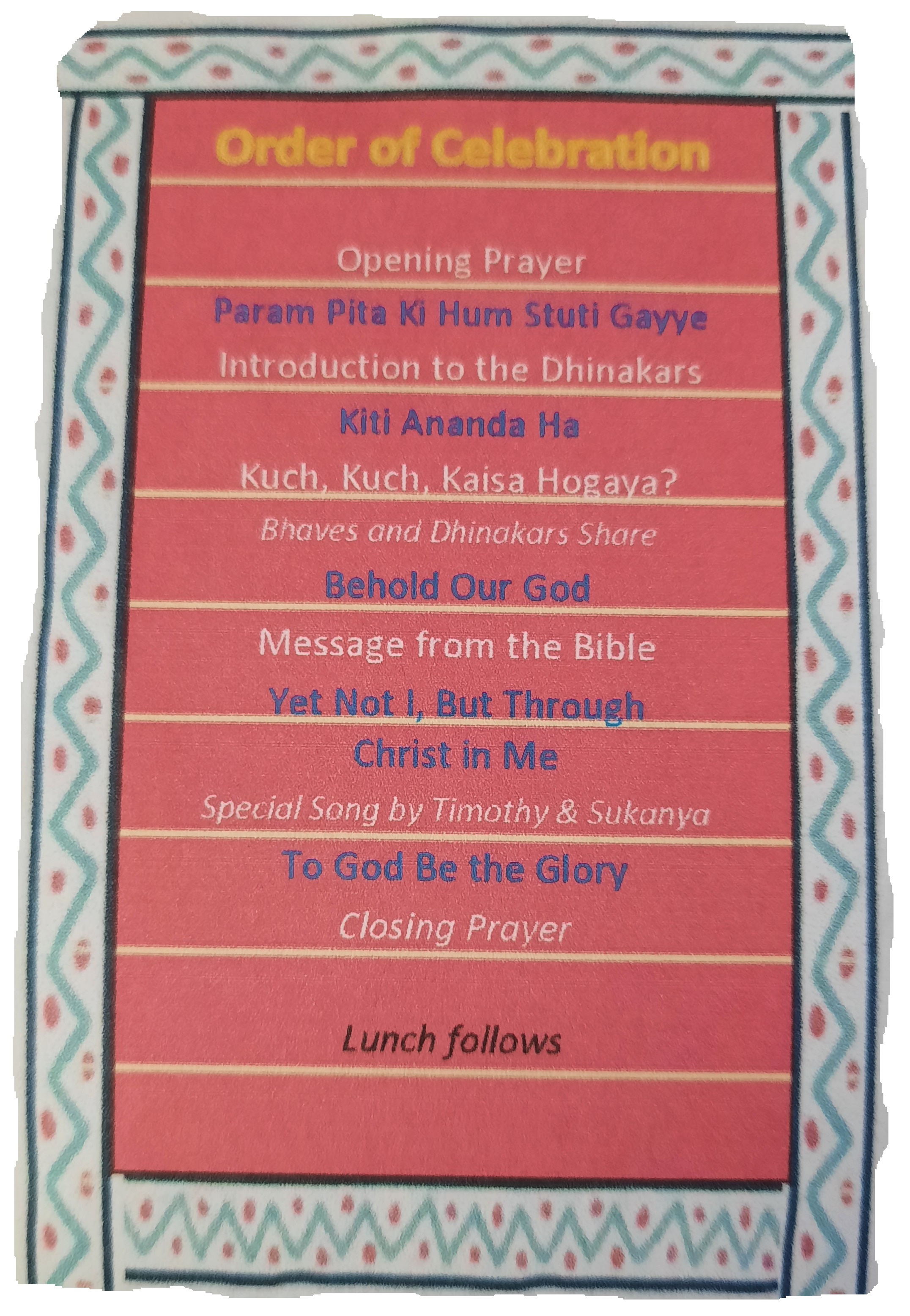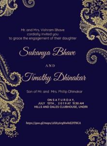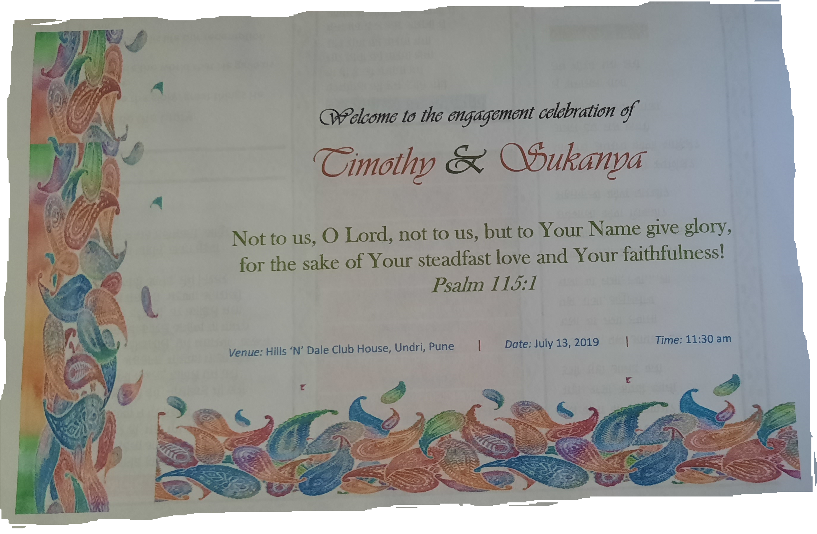 The function began with prayer after which we sang songs of praise to God in Hindi, Marathi, and English. Also included was a time when Vishram introduced us—Tim’s family—to the gathering of friends and family. Vishram, Hema, Philip and I described to the audience how it came about that Tim living in faraway Auckland came to be engaged to Shama in Pune. Of course, we could only give all glory to the Lord.