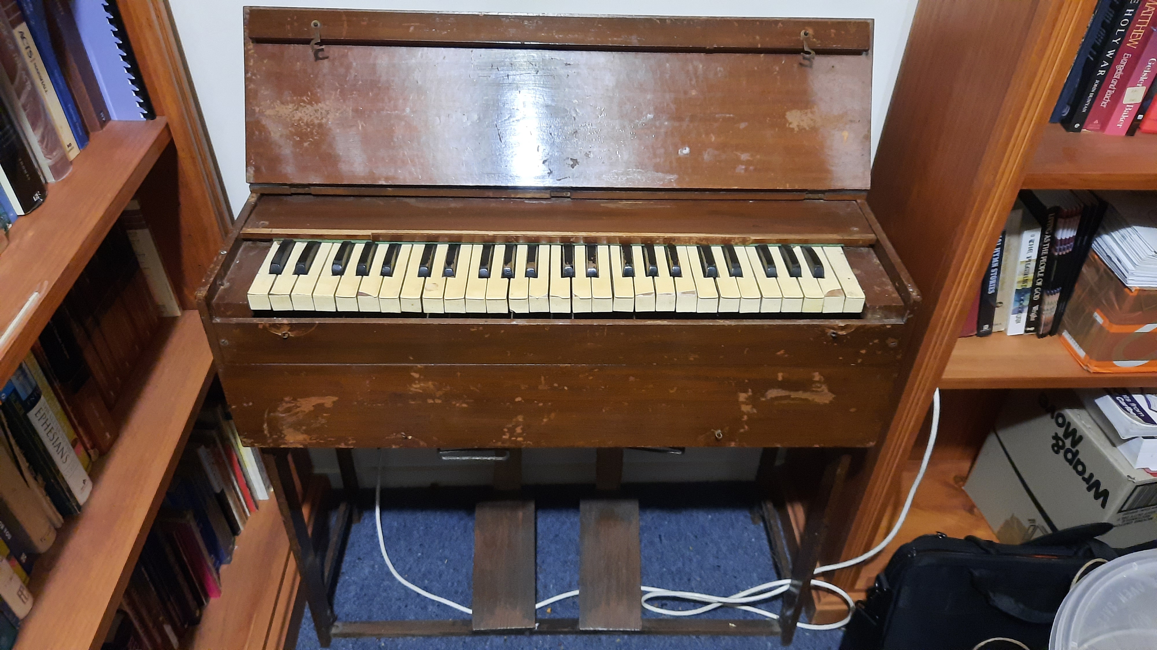 Later, as a pastor himself, my grandfather would fold down this versatile little instrument and, carrying it on his shoulder, take it to the villages where he was serving, set it up under the shade of a tree, and teach Sunday School. I do not know much about what use it was put to in the intervening years, but after it came to our home in the 1970s, my father used it a lot to sing and teach.