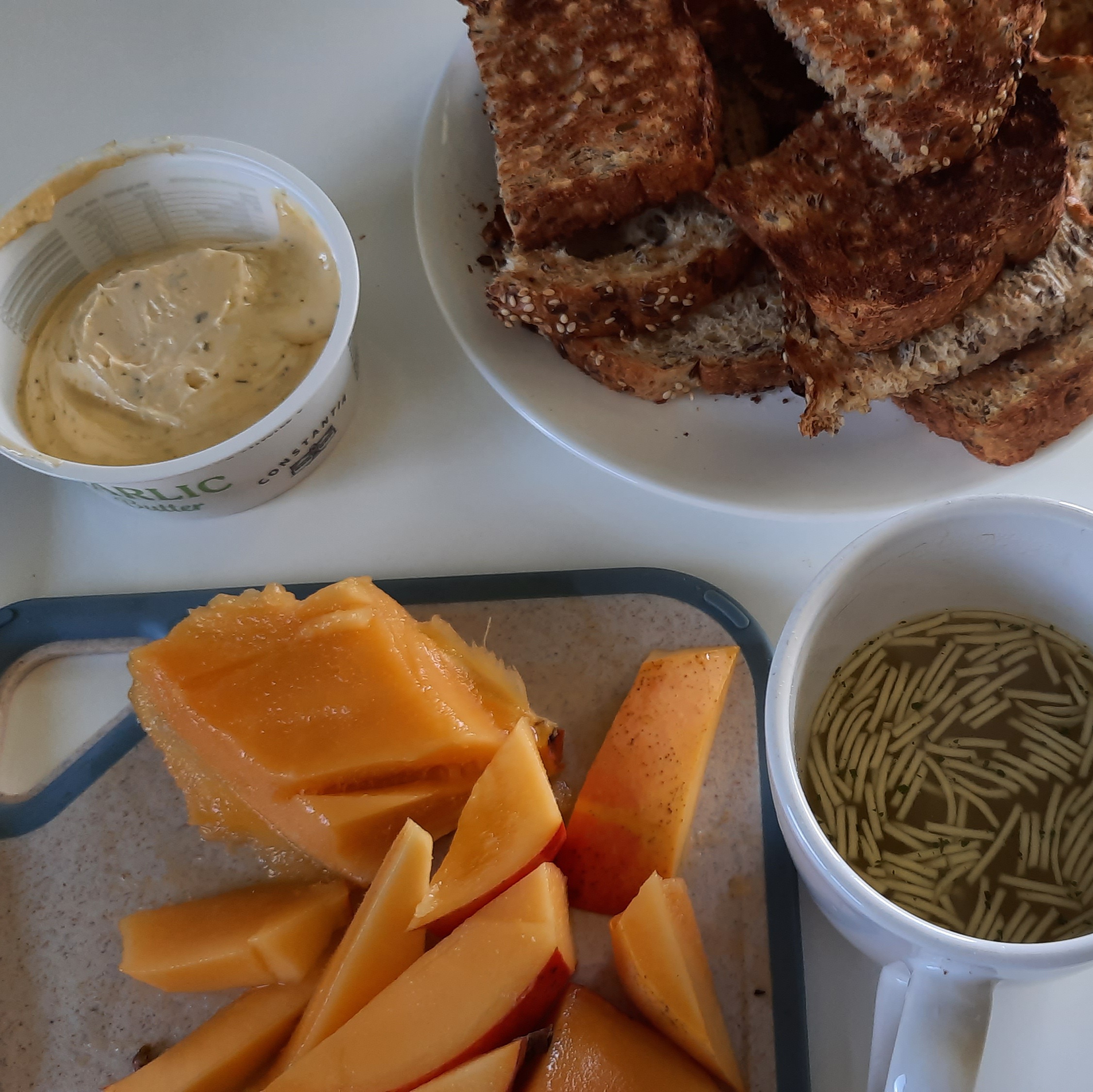 Improvised lunch of toast and garlic butter with soup and mango.