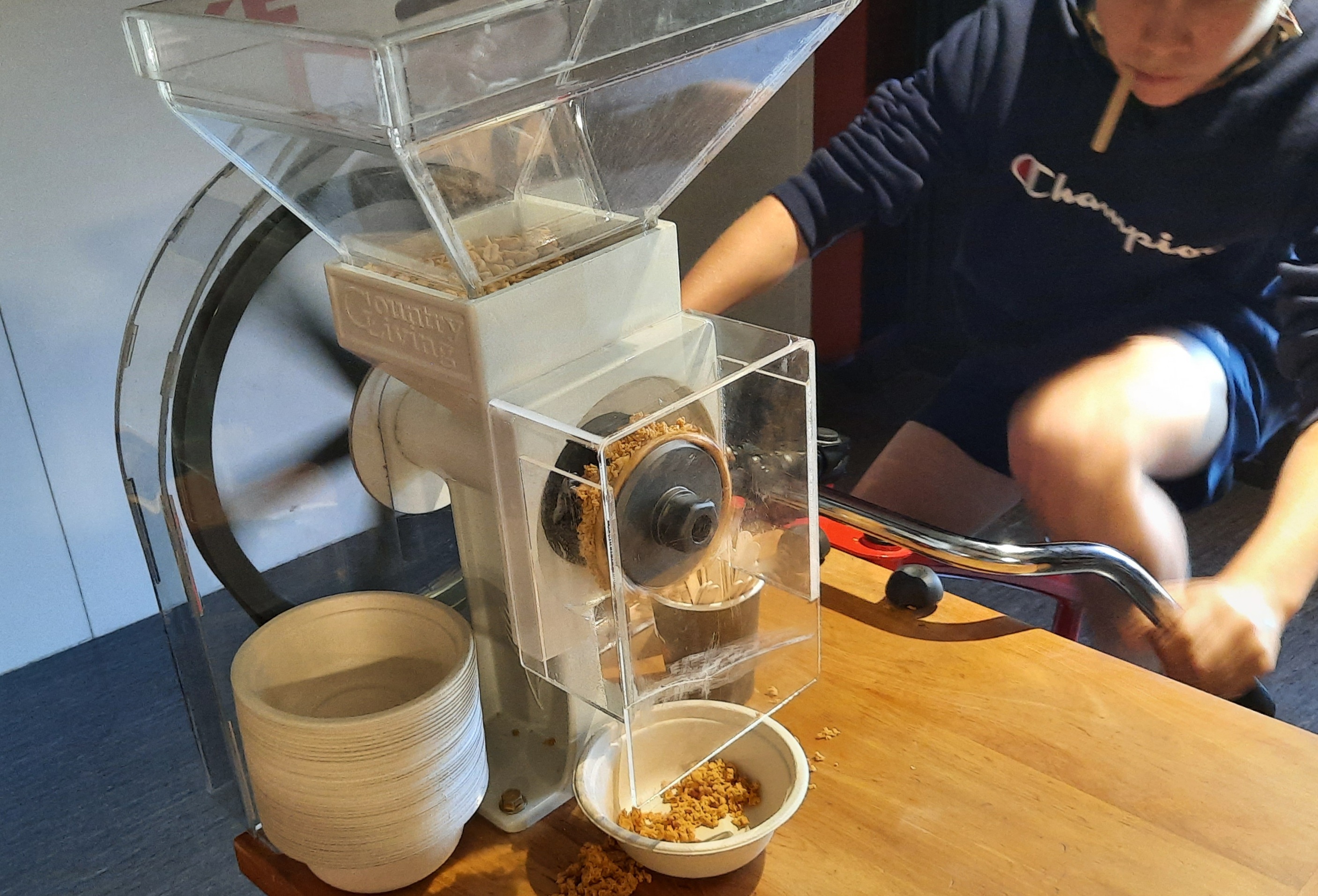 Our touristy day began at 10:00 a.m. with a tour of Pic’s Peanut Butter World, which we had prebooked. It is a tour that families with children would most certainly enjoy. They tell you all kinds of interesting details—Pic (Pic Picot) is the name of the founder, Peanuts are legumes, The peanut plant flowers above the ground and fruits below the ground, and so on. We got to see the 14m peanut roaster, and the workers packing the product into glass jars.