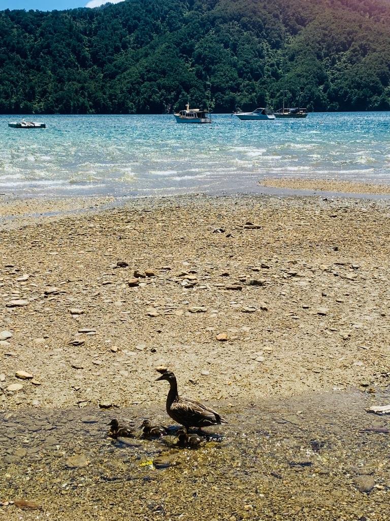 We then stopped at Momorangi Bay Camp and Cafe to see if we could get something for lunch but settled for a packet of chips and a rest, before taking to the road again. Everything about this stop was fabulous—the breeze, the view, and even the mama duck who came by with her ducklings in tow.