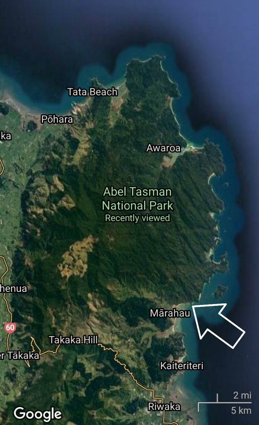 Finally we reached Marahau village and entered the Abel Tasman National Park. The park is huge and its Coast track is famous. We can now say that we have walked the track. Ok we just covered the tiniest possible 10-minute piece of it, near where the arrow is pointing in the map.